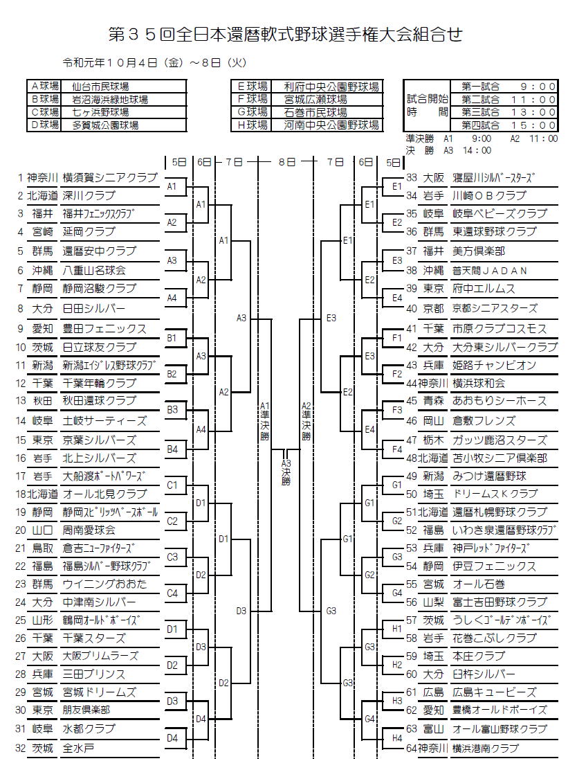 ・ 第1回 ・Bブロック:2.7(火)於深江球場9:00~11:00,対象チーム:須磨SX・阪神RY・神戸RF ・Fブロック:3.1(水)於向陽台9:00~11:00(予備日3.7(火)),対象チーム:三田PS・川西JA・北摂KG ・Aブロック:3.1(水)於住友金属鉱山播磨野球場9:00~11:30,対象チーム:姫路CP・三木AL・稲美KG・西神CH・播磨NS ・Dブロック:2.24(金)於クボタグランド9:00~11:00,対象チーム:西宮SS・甲子園ST・兵庫SS ・Eブロック:2.27(月)於宝塚SC9:00~10:30,対象チーム:伊丹MS・尼崎PP・宝塚GS ・Cブロック:3.15(水)於芦屋中央公園,11:30~の交流戦にて,対象チーム:芦屋還暦・芦屋CS・芦屋GT NEW ・ 第2回 ・9月~10月 ,各ブロックにて開催予定 |